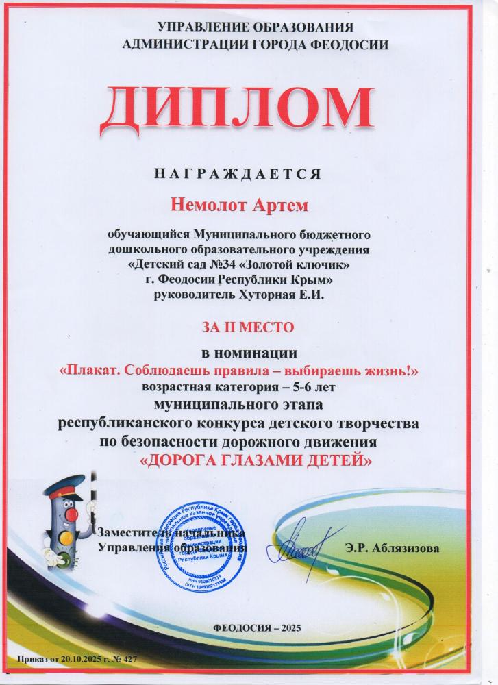 - Немолот Артема (II место) в номинации "Плакат. Соблюдаешь правила - выбираешь жизнь!"