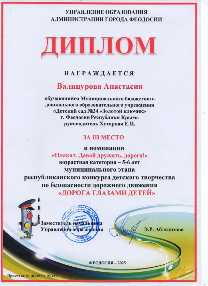 - Валинурову Анастасию (III место) в номинации "Плакат. Давай дружить, дорога!" муниципального этапа Республиканского конкурса детского творчества по безопасности дорожного движения «Дорога глазами детей»